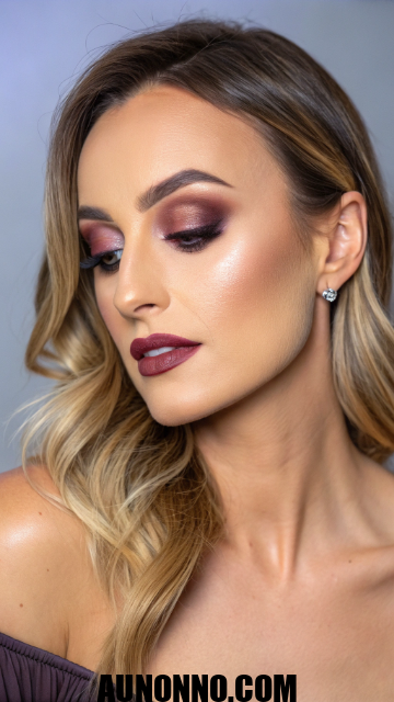 A combination of berry tones and neutral shades creates sophisticated balance in this new year’s eve makeup look. Deep berries on your eyes paired with nude lips deliver impact without overwhelming your natural features. This approach works for those who want drama with wearability and balance throughout their face.