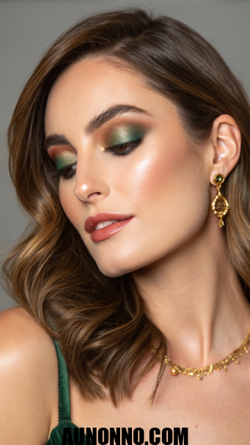 Pair this jewel-tone eye makeup with a nude, warm bronze, or nude-gold lipstick to keep focus on your statement eyes. Use a warm blush in peach or bronze to complement the emerald and prevent color clashing throughout your face. Apply a subtle gold or champagne highlighter to catch light without competing with your dramatic emerald eye color.