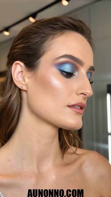 Apply a light silver or icy eyeshadow across your entire lid, then layer metallic midnight blue on top using a damp brush. The wet application intensifies color and creates that shimmering, almost liquid appearance that catches light beautifully. Use a darker navy or blue-black eyeliner on your waterline to deepen the look and define your eyes.