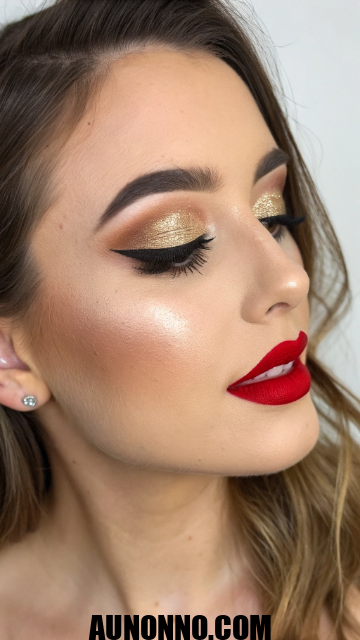 Nothing captures new year’s eve glamour like a bold red lip paired with shimmering gold eyeshadow. This classic combination feels universally flattering and photographs beautifully under all lighting conditions. Red represents power and celebration while gold adds the sparkle needed to ring in the new year properly.