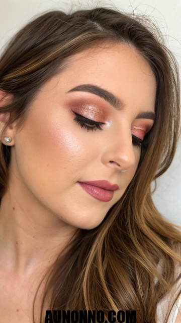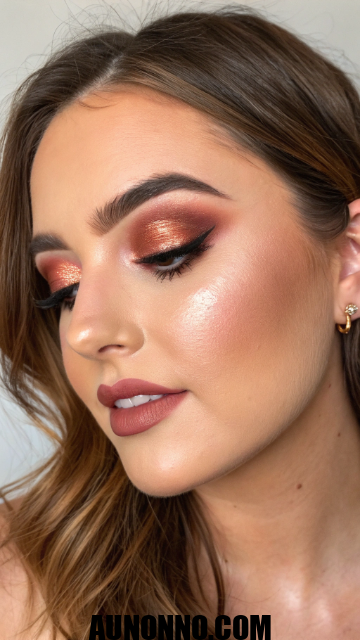 Warm metallic tones in copper and bronze create an earthy yet glamorous new year’s eve makeup look. These colors work beautifully on warm skin tones and add richness without feeling heavy or overdone. The combination feels luxurious and special while remaining wearable for actual celebration environments.