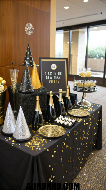 A dedicated table with party hats and noisemakers lets guests gear up for the midnight celebration. Guests can grab accessories as they arrive and wear them throughout the evening. This creates a fun, festive photo opportunity and builds excitement.