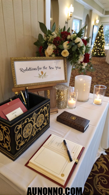 A resolution guest book offers a unique keepsake from your wedding. Guests write their New Year’s resolutions on cards or pages that you’ll treasure afterward. This activity creates a meaningful connection to your celebration beyond just the party.