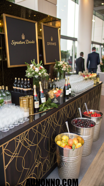 Create a beautiful display with bottles, garnishes, and decorative elements. Hire a skilled bartender to oversee and assist guests. Offer both alcoholic and non-alcoholic options. Use metallic or festive labels for each drink option. This interactive station creates entertainment and conversation. Guests appreciate the quality and personalization of their drinks.