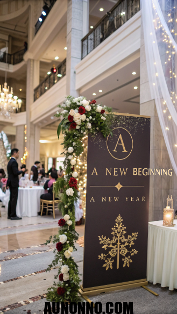 Strategic signage creates photo opportunities and reinforces the New Year’s Eve theme throughout your reception. Hang banners with messages like “Happy New Year” or “A New Year, A New Beginning” in prominent locations. The signage gives guests visual reminders of the occasion.