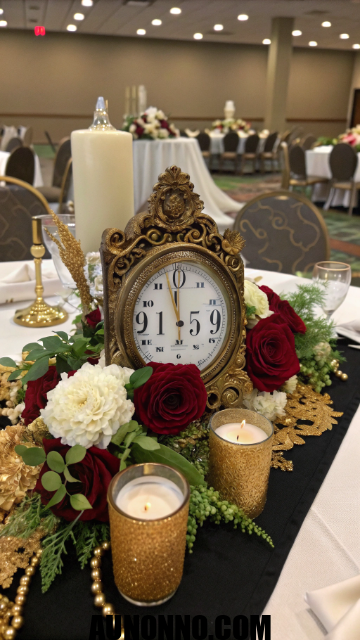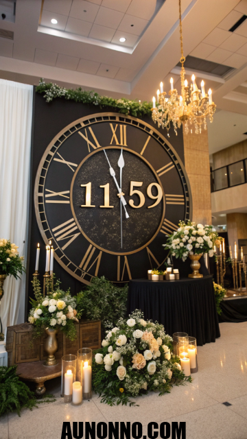 A large decorative clock serves as a powerful visual reminder of the midnight countdown. Position it prominently in your reception area where guests can see the time. The statement clock becomes a focal point for photos and conversation.