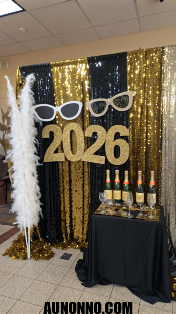 A photo booth with New Year’s Eve props gives guests fun memories to take home. Include sparkly backgrounds, oversized glasses shaped like the year, and festive signage. Guests spend time at the booth taking photos and creating content to share on social media.