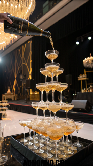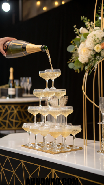 A champagne tower serves as both a functional and decorative element for your midnight celebration. Stacking champagne glasses in a pyramid shape creates a dramatic focal point. The tower builds anticipation for the midnight toast and champagne moment.