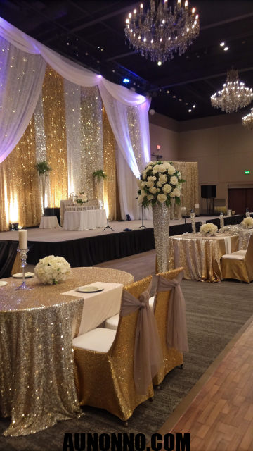 Sequins catch light and create sparkle throughout your celebration. Table runners with sequins, sequined pillows, and sequined wall draping all contribute to the glamorous atmosphere. The shimmering effect works beautifully in both photography and person.