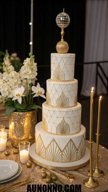 Your wedding cake can steal the show with its elegance and festive details. Consider a three or four-tier cake decorated with gold metallic fondant and Art Deco designs. The cake becomes a centerpiece that guests anticipate and admire throughout the reception.
