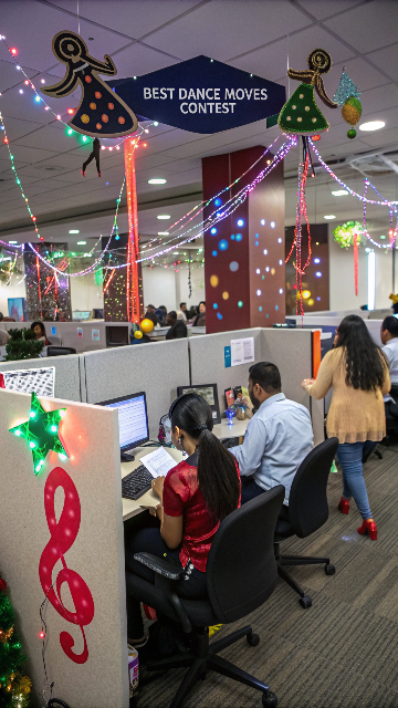 Create a holiday music and dance corner where employees can decorate a space with musical notes, instruments, and festive decorations. This area can serve as a fun break spot where employees can enjoy holiday music and even have mini dance-offs during breaks.