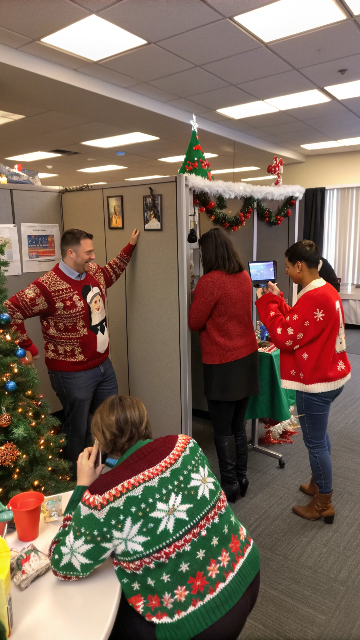 Host a Christmas sweater day where employees can wear their most festive sweaters to work. This can be a fun way to kick off the holiday spirit and can be combined with a decorating contest. Employees can vote for the best sweater, and the winner can receive a prize.