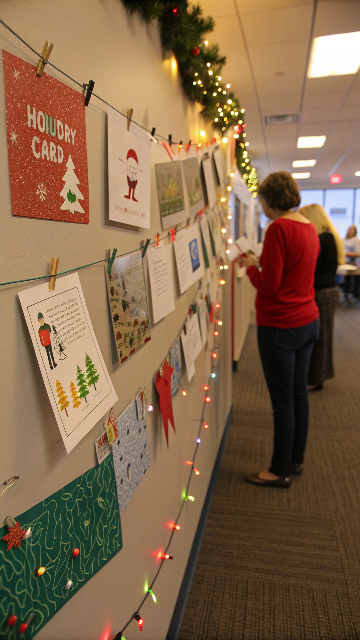 Set up a holiday card exchange wall where employees can hang their holiday cards for everyone to see. Encourage teams to create handmade cards that reflect their personalities or department themes. This not only adds a personal touch to the office decor but also fosters a sense of community.