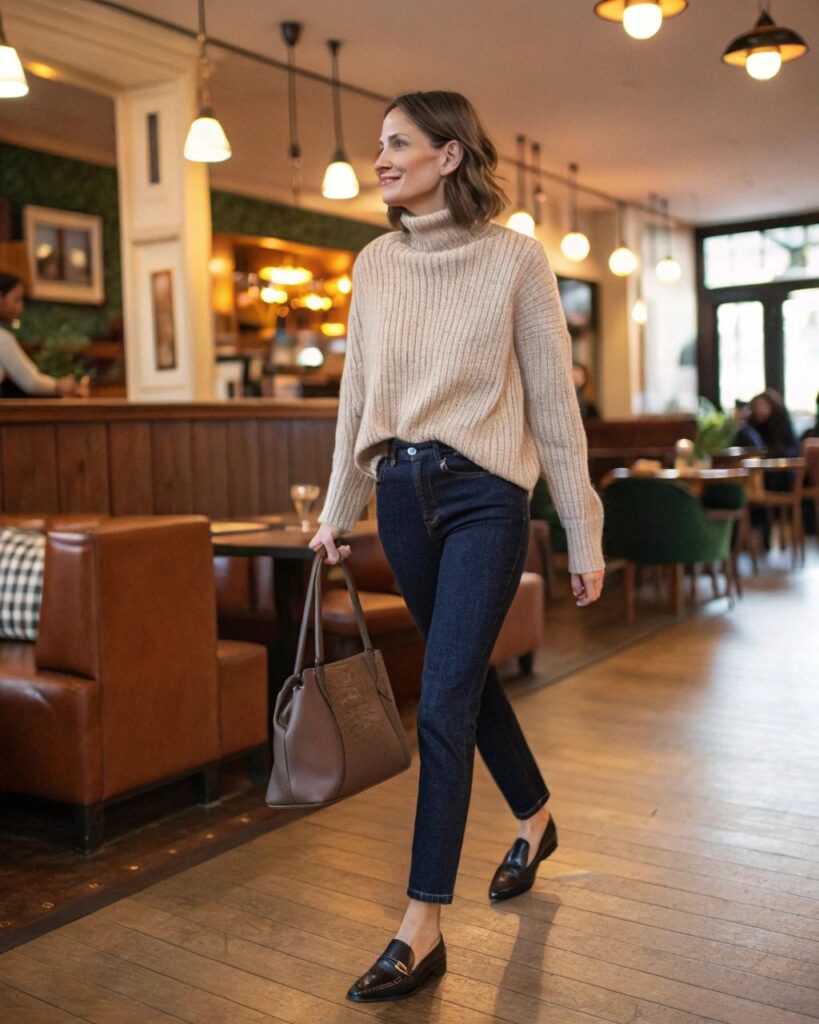 Layer the blazer over a turtleneck for added warmth. Add loafers and a leather tote for a polished finish. This outfit is both comfortable and stylish.