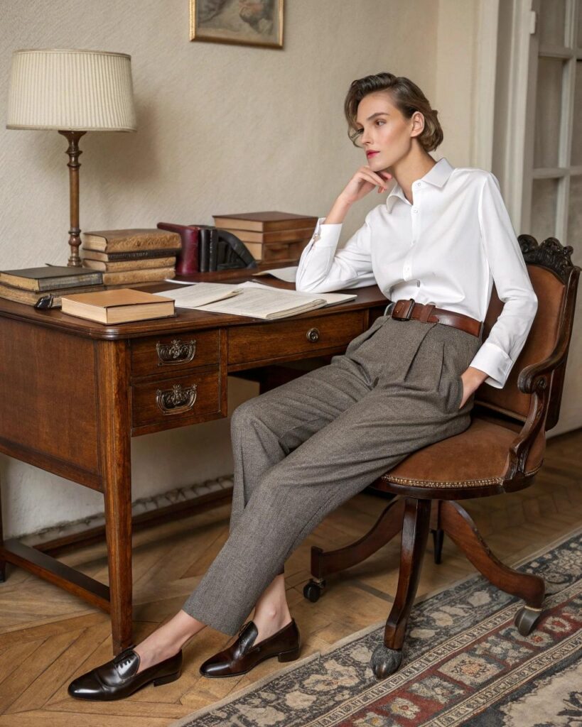 Tailored wool trousers paired with a crisp blouse are a cornerstone of old money style. The trousers offer a structured fit, while the blouse adds a touch of femininity. This outfit is perfect for office settings or formal lunches.