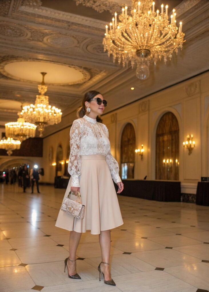 A lace blouse paired with a skirt is a feminine old money outfit. The delicate fabric of the blouse adds texture, while the skirt provides structure. This combination is perfect for weddings or formal gatherings.