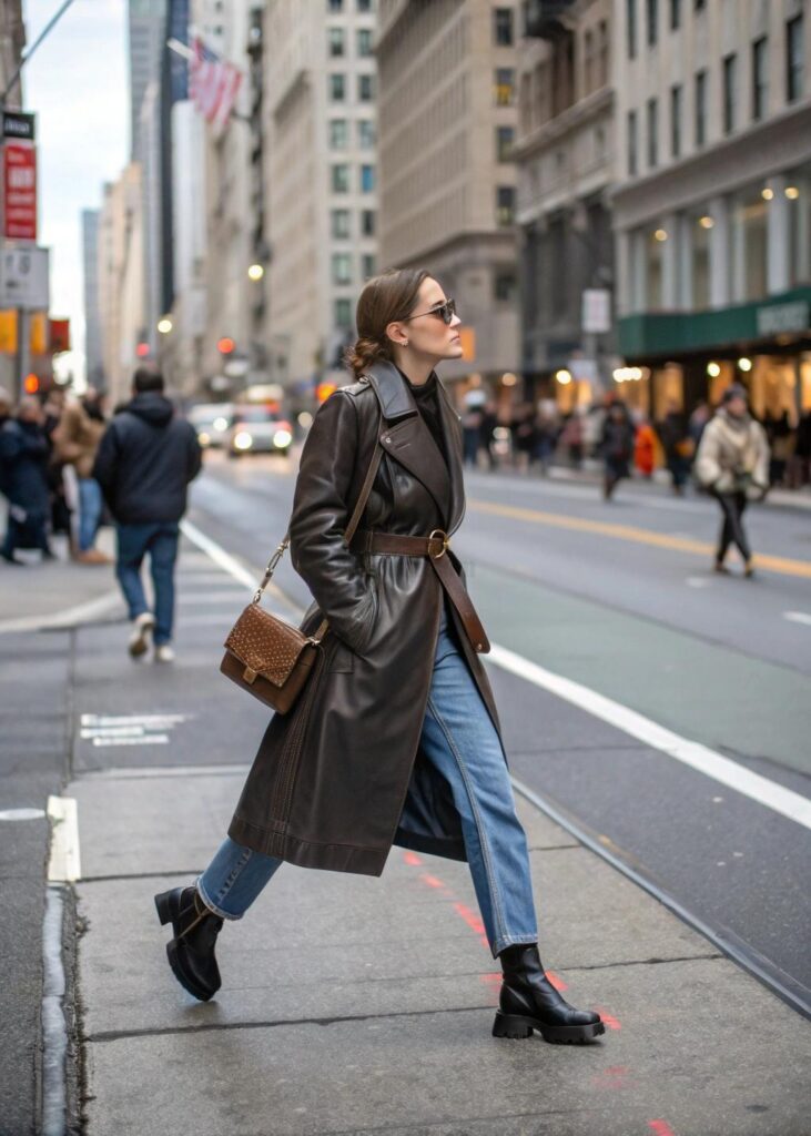 A leather trench coat paired with jeans is a modern old money outfit. The coat adds edge, while the jeans provide a relaxed fit. This combination is perfect for city outings or casual dinners.