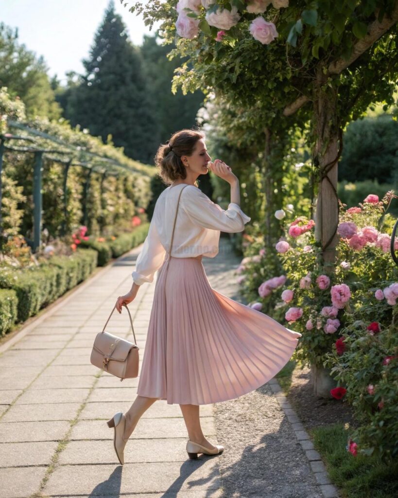 A pleated midi skirt paired with a blouse is a feminine and sophisticated old money outfit. The flowing skirt adds movement, while the blouse provides a structured top. This combination is perfect for brunches or afternoon tea.