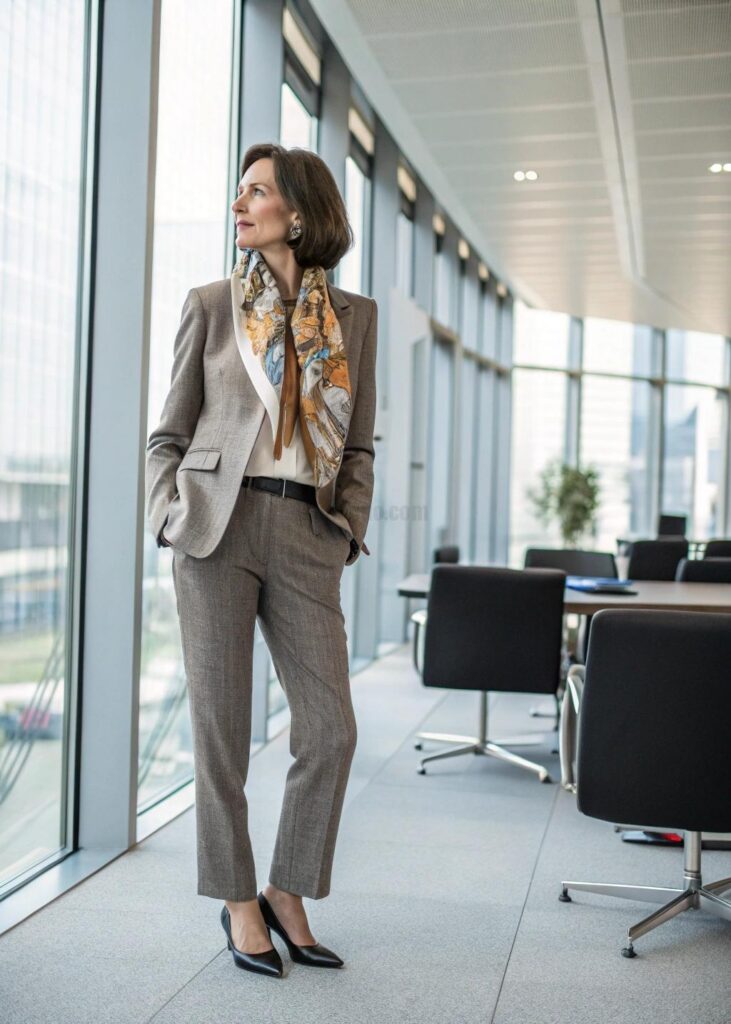 Layer the scarf over a simple blouse for a refined look. Add tailored trousers and pumps for a complete ensemble. This outfit is both powerful and stylish.