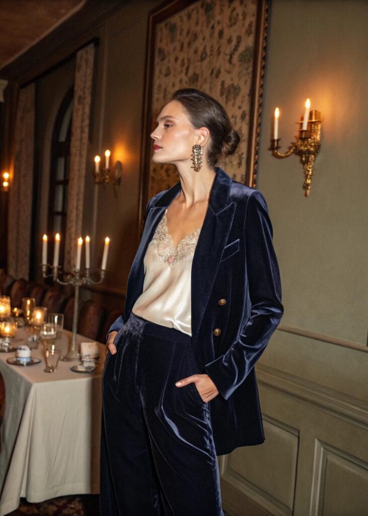 A velvet blazer paired with matching trousers is a luxurious old money outfit. The rich fabric adds depth, while the tailored fit ensures a polished look. This set is perfect for evening events or holiday parties.