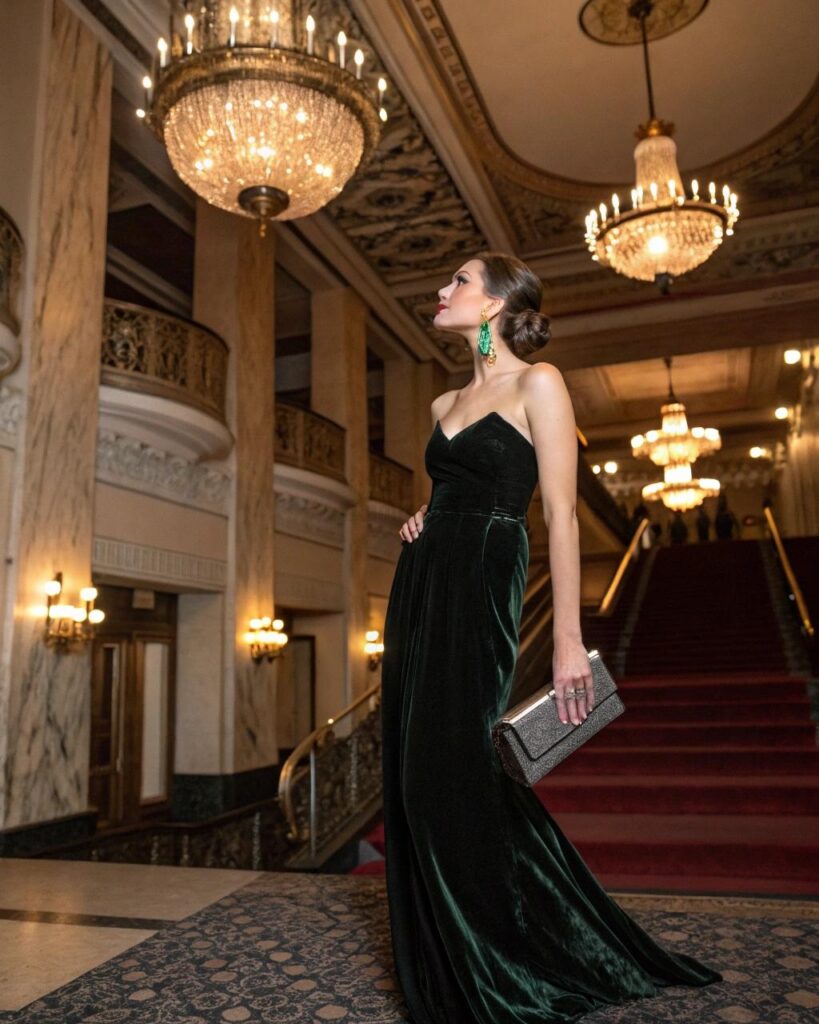 A velvet evening gown is the ultimate old money outfit for formal events. The rich fabric adds depth, while the fitted silhouette enhances elegance. This gown is perfect for galas, operas, or black-tie events.