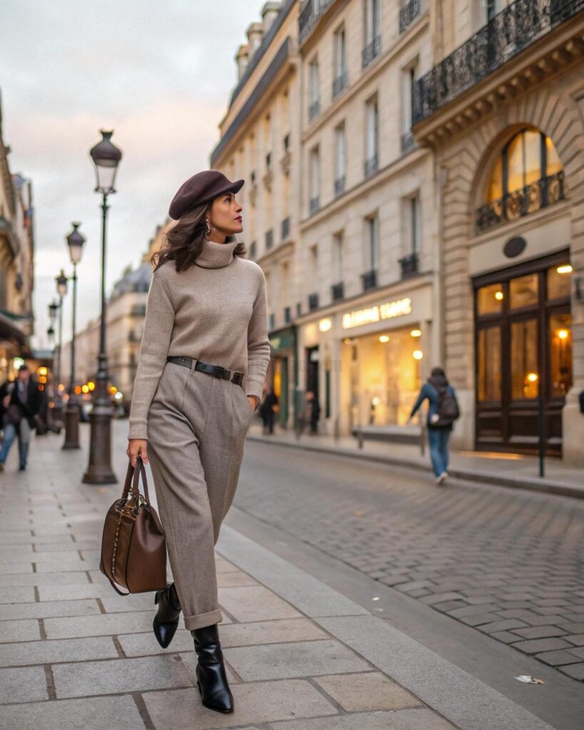 A wool beret paired with a turtleneck is a chic old money outfit. The beret adds a touch of French elegance, while the turtleneck provides warmth. This combination is perfect for fall or winter outings.
