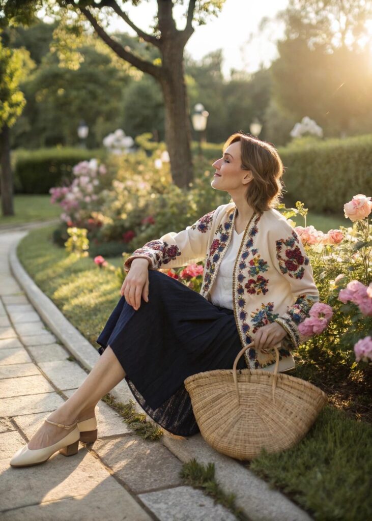 An embroidered cardigan paired with a midi skirt is a charming old money outfit. The cardigan adds texture, while the skirt provides a flowing silhouette. This combination is ideal for afternoon tea or garden parties.