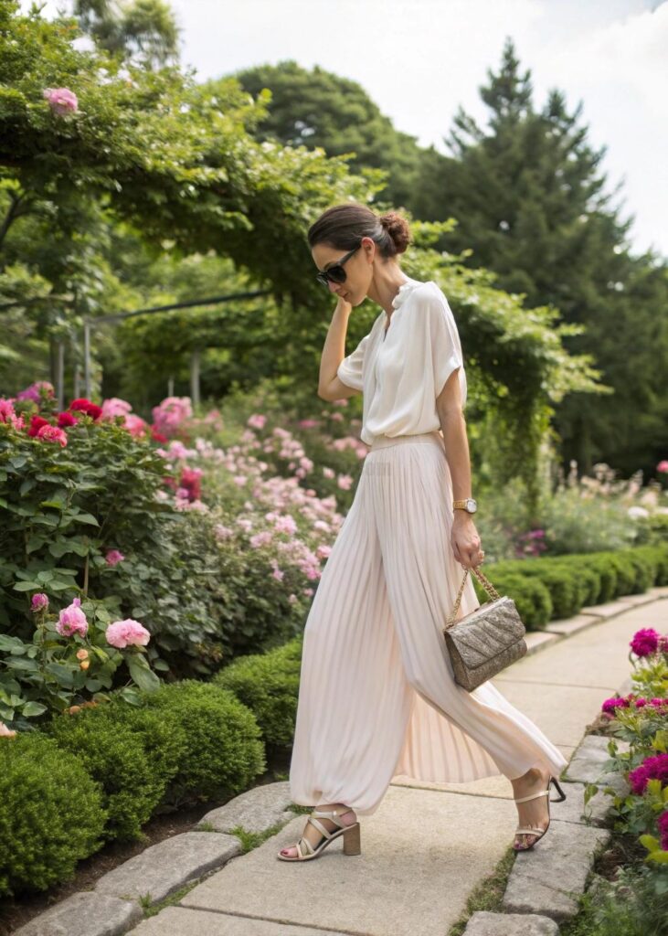 Pleated palazzo pants paired with a blouse are a chic old money outfit. The flowing pants add movement, while the blouse provides structure. This combination is perfect for summer parties or outdoor events.
