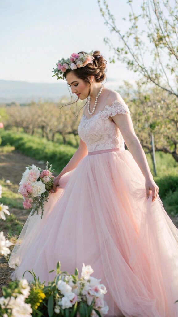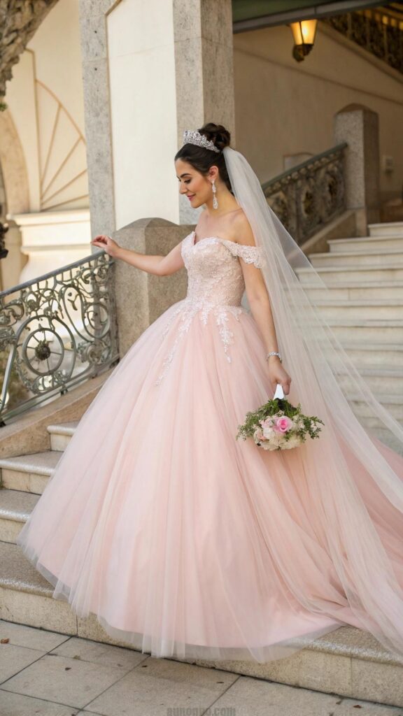 The dress features a fitted bodice with intricate lace detailing and a full tulle skirt. The blush pink color is perfect for a spring or summer wedding. It’s a dress that combines romance with elegance.