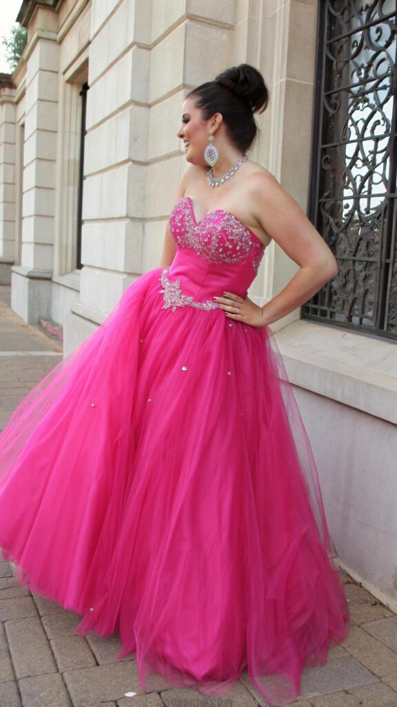 Pair this gown with a floral crown and soft makeup for a cohesive look. The soft pink tone pairs well with pearl or gold jewelry. It’s a dress that will make you feel like a fairytale princess.
