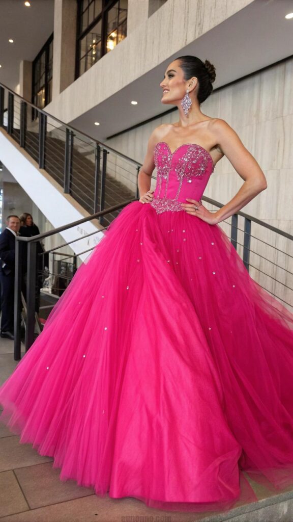 The dress features a fitted bodice with intricate beading and a full tulle skirt. The hot pink color is perfect for a summer wedding or a glamorous event. It’s a dress that combines boldness with elegance.