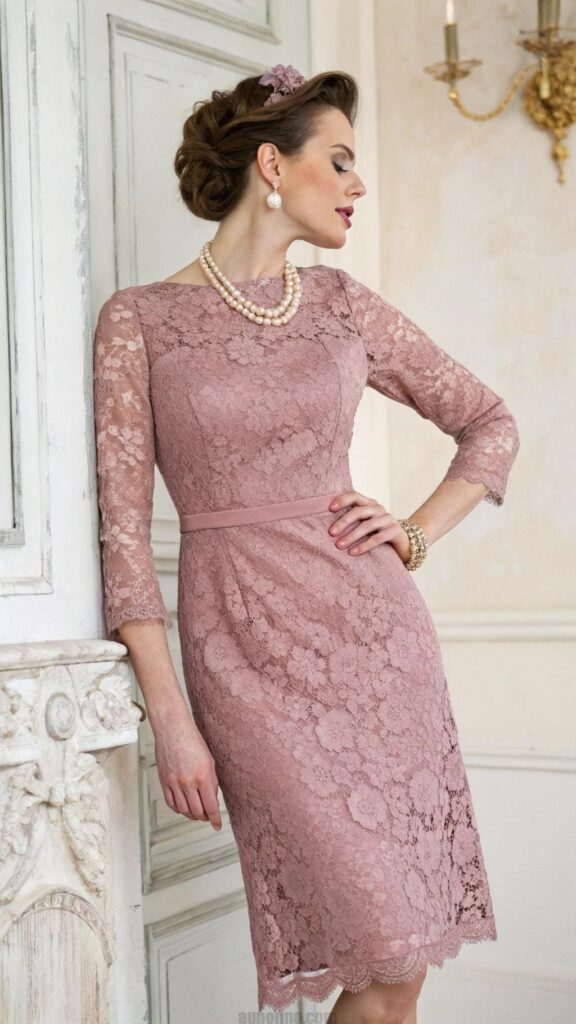 The dress features a fitted silhouette with a high neckline and long sleeves. The mauve pink color is perfect for a fall or winter wedding. It’s a dress that combines vintage charm with modern elegance.