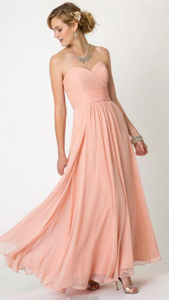 The dress features a sweetheart neckline and a flowing skirt that moves gracefully. The peach pink color is perfect for a garden or outdoor ceremony. It’s a dress that combines romance with elegance.