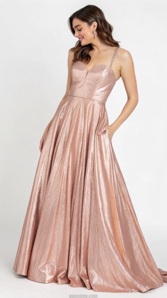 Pair this gown with minimalist jewelry and soft waves for a polished look. The metallic hue pairs well with both gold and rose gold accessories. It’s a dress that will make you feel effortlessly stylish.