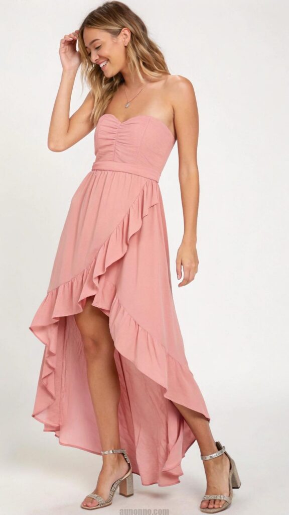 The dress features a fitted bodice with a sweetheart neckline and a high-low skirt. The rose pink color is perfect for a beach or garden wedding. It’s a dress that combines fun with elegance.