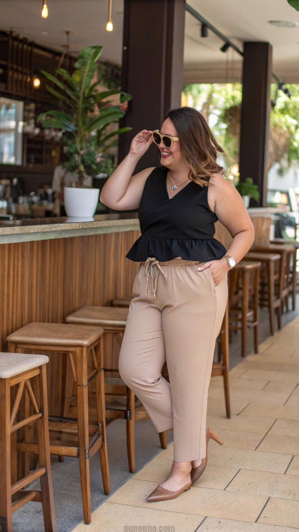 Choose high-waisted pants in a flowy fabric for maximum comfort. Tuck in your peplum blouse completely to highlight the waist tie. Finish with pointed-toe flats for a polished touch.