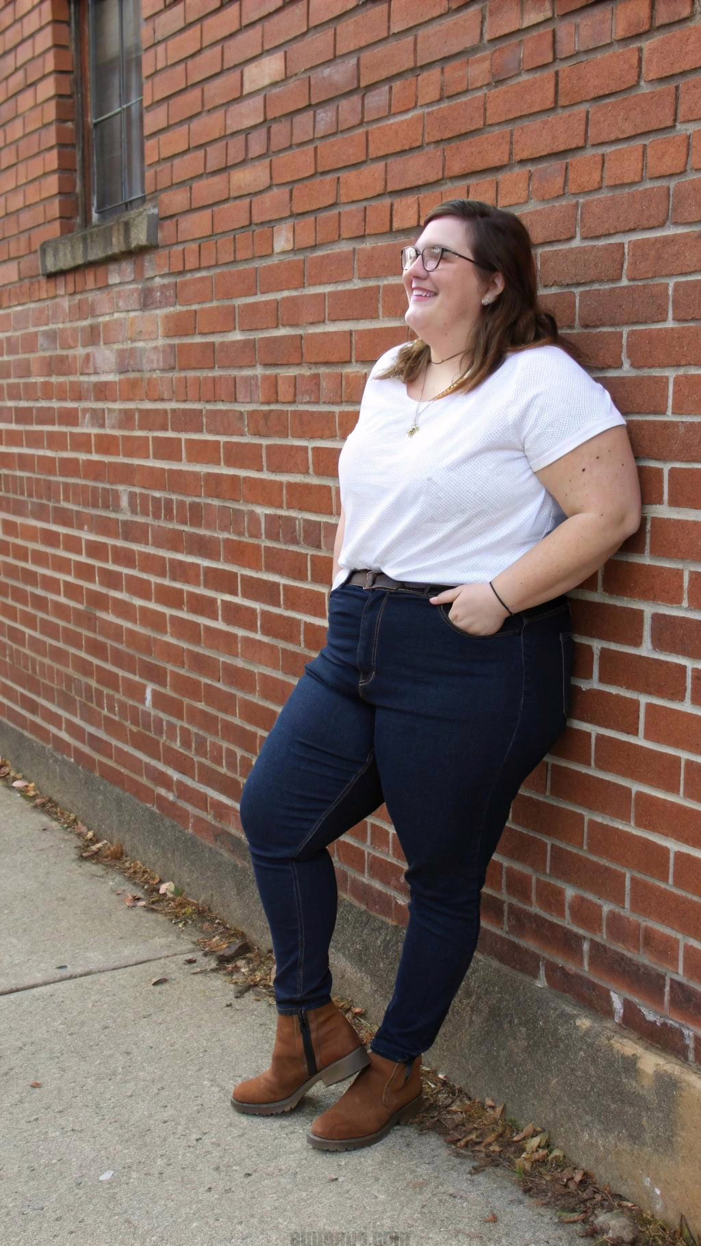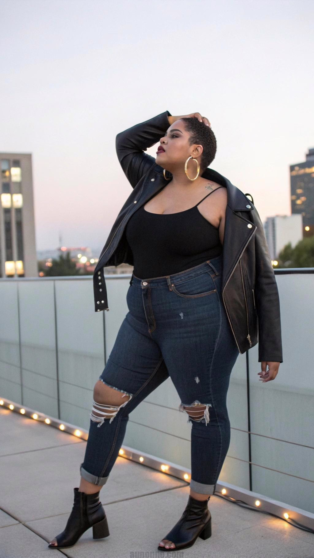 High-waisted jeans are a must-have for plus-size wardrobes. They accentuate the waist and pair perfectly with a fitted tee. This combo is simple yet effortlessly stylish.