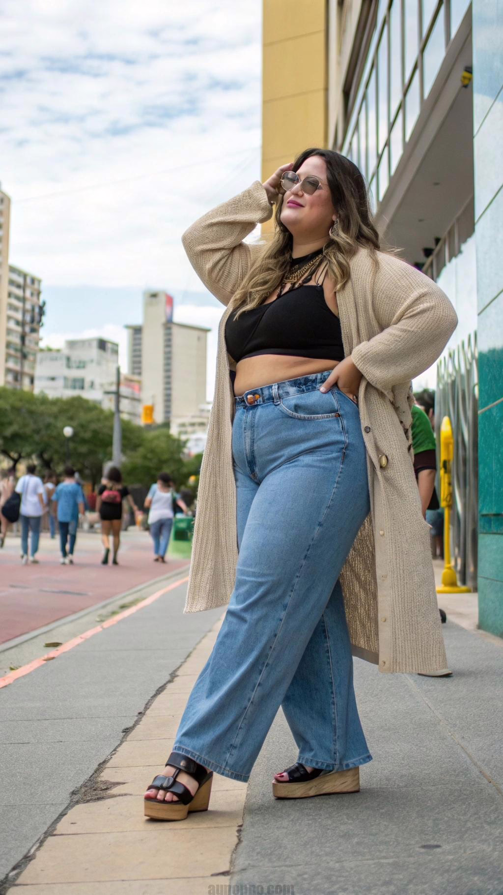 Wide-leg jeans balance out a fitted crop top perfectly. The high waist provides coverage while still showing a hint of skin. A long cardigan or duster jacket adds movement.