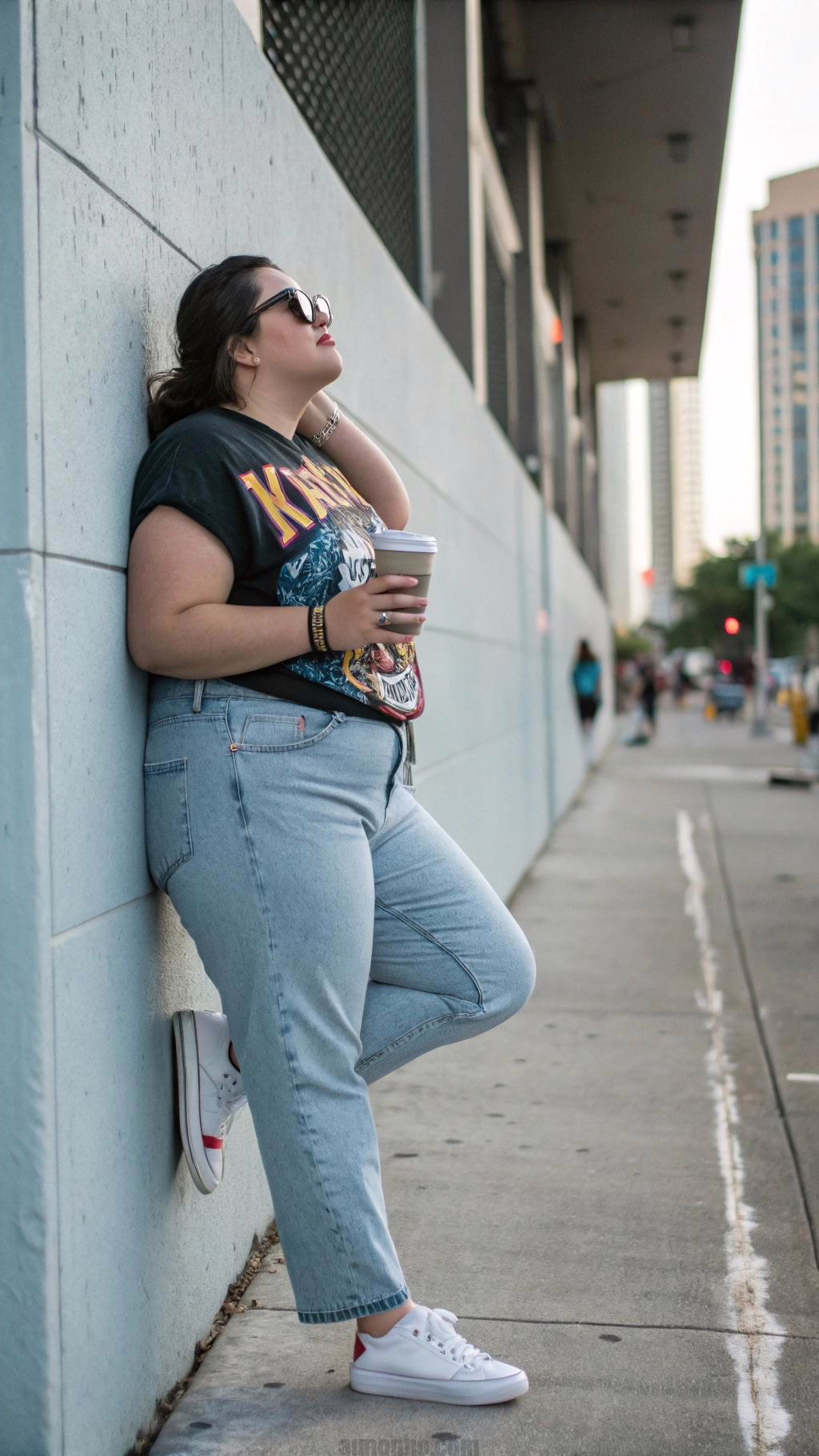 Choose a graphic tee with bold prints or fun slogans for personality. Tuck it in slightly to define your waist. Add hoop earrings and a denim jacket for extra flair.