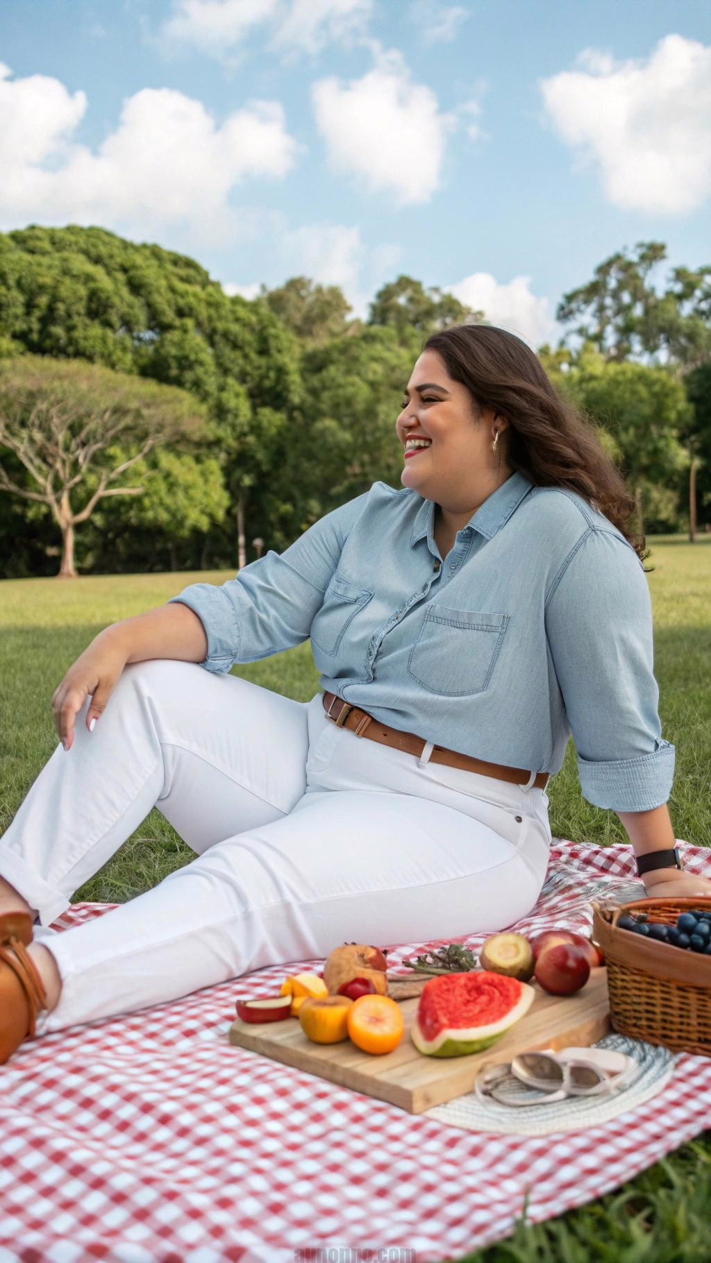 A classic chambray shirt tucked into white jeans is eternally fresh. This combo works year-round and transitions easily between seasons. The light colors are especially flattering in sunlight.