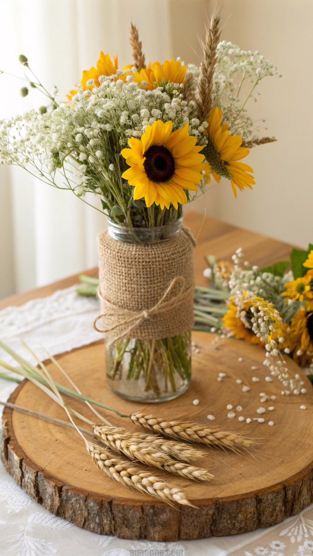 Burlap-wrapped vases give a rustic yet polished look. Sunflowers add a bright, cheerful pop of color. This combination is perfect for a country or barn wedding.