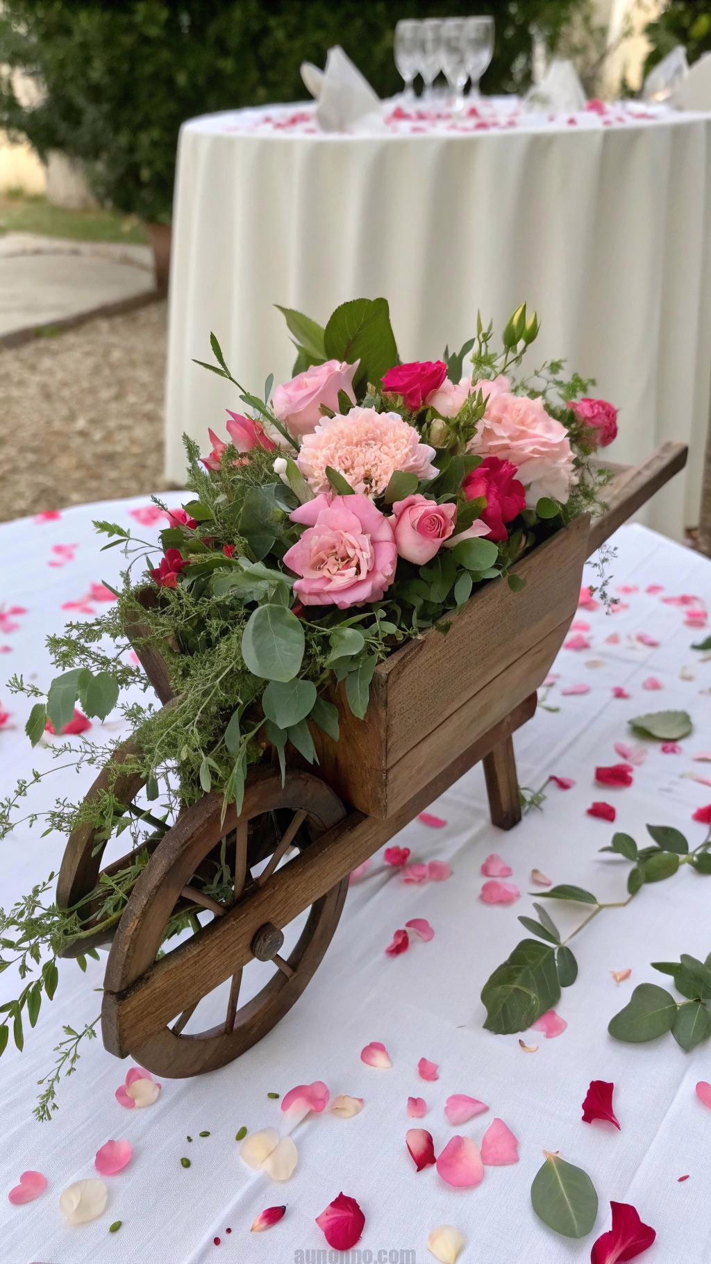 A small wooden wheelbarrow filled with flowers is a unique rustic wedding centerpiece. It adds a playful, farm-inspired touch to your tables. Fill it with seasonal blooms, pumpkins, or herbs for a fresh look.