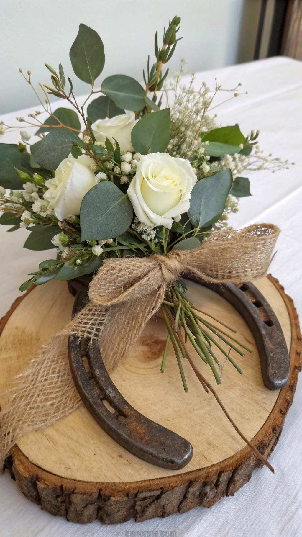 A large horseshoe makes a symbolic rustic centerpiece base. Wrap it with greenery and small blooms for a circular arrangement. The metal adds an equestrian touch.
