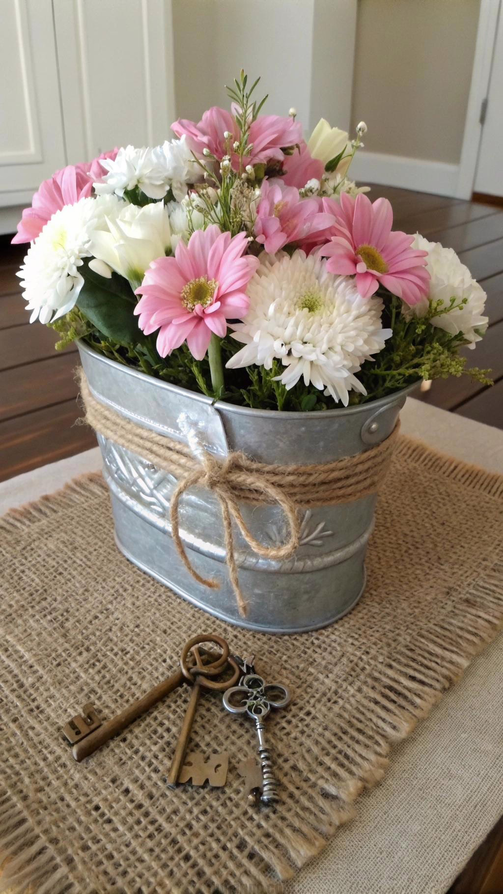 Galvanized metal tubs filled with flowers give an industrial rustic vibe. The silver tone contrasts nicely with colorful blooms. This works well for farmhouse or warehouse weddings.