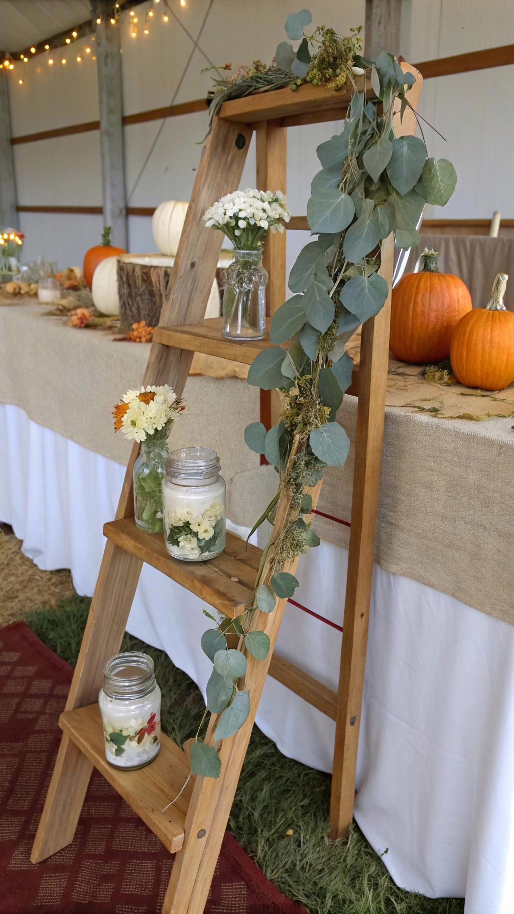 A miniature wooden ladder makes a creative display for multiple arrangements. Place small jars or bottles on each rung with individual blooms. The vertical design saves table space.