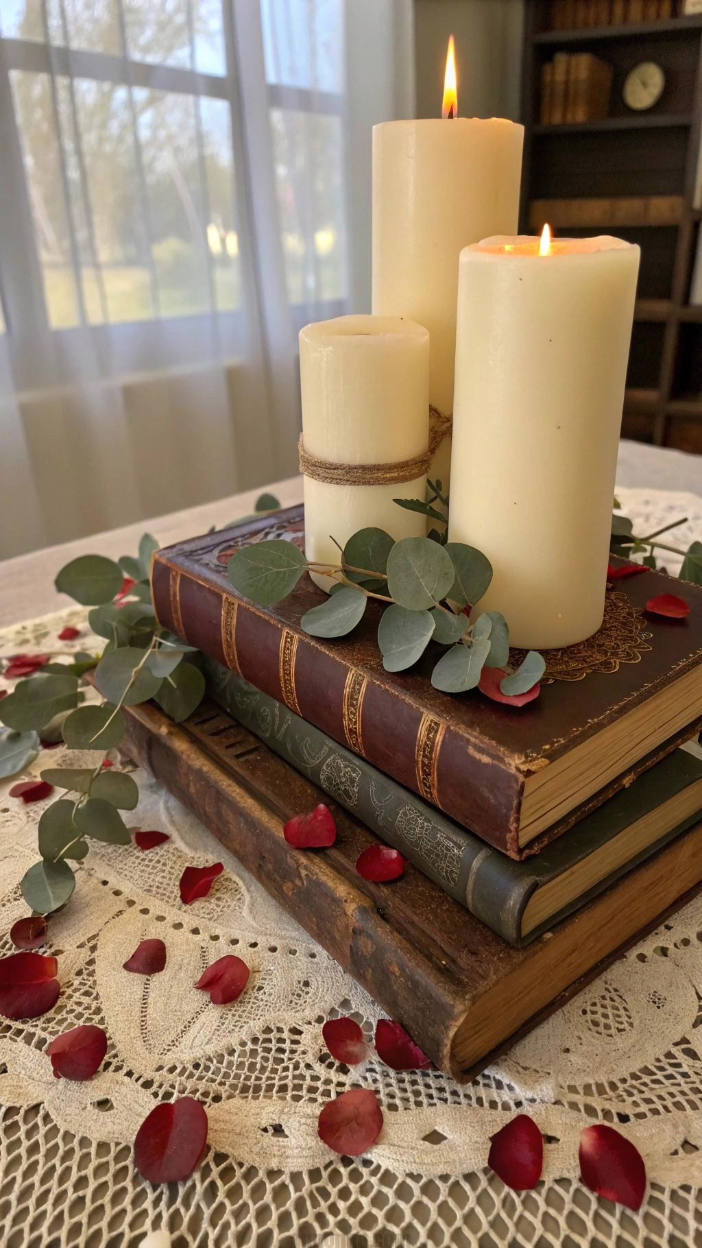 Stacked antique books with taper candles create a vintage rustic centerpiece. The worn pages and candlelight add warmth and nostalgia. This works well for literary-themed or old-world weddings.