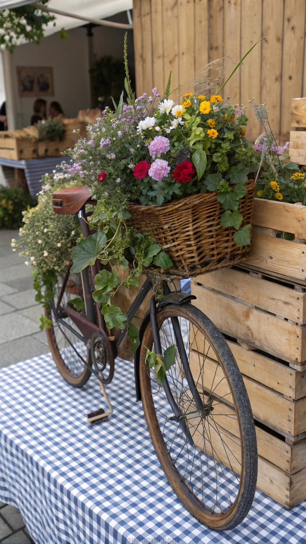 A vintage bicycle basket makes a whimsical rustic centerpiece. Line it with burlap before adding your floral arrangement. Use trailing flowers like sweet peas for movement.