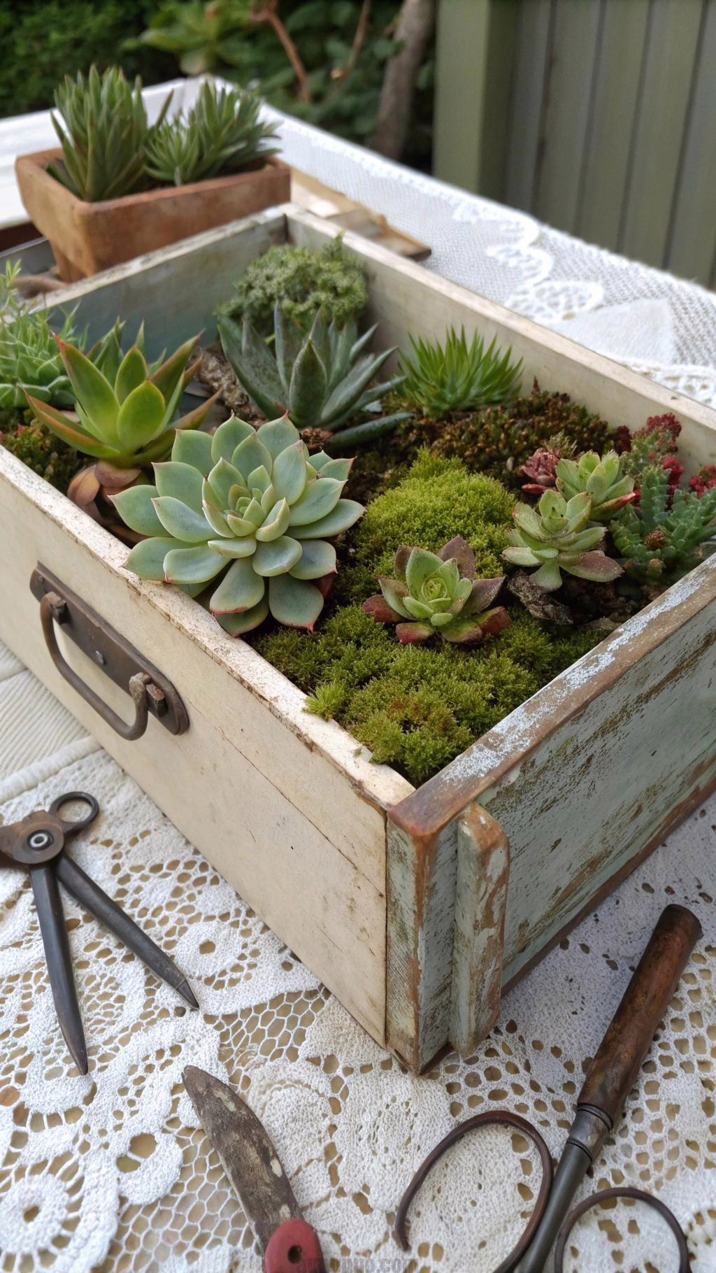 An old dresser drawer makes a unique planter for rustic centerpieces. The worn wood adds instant vintage charm. Fill it with succulents, herbs, or seasonal flowers.