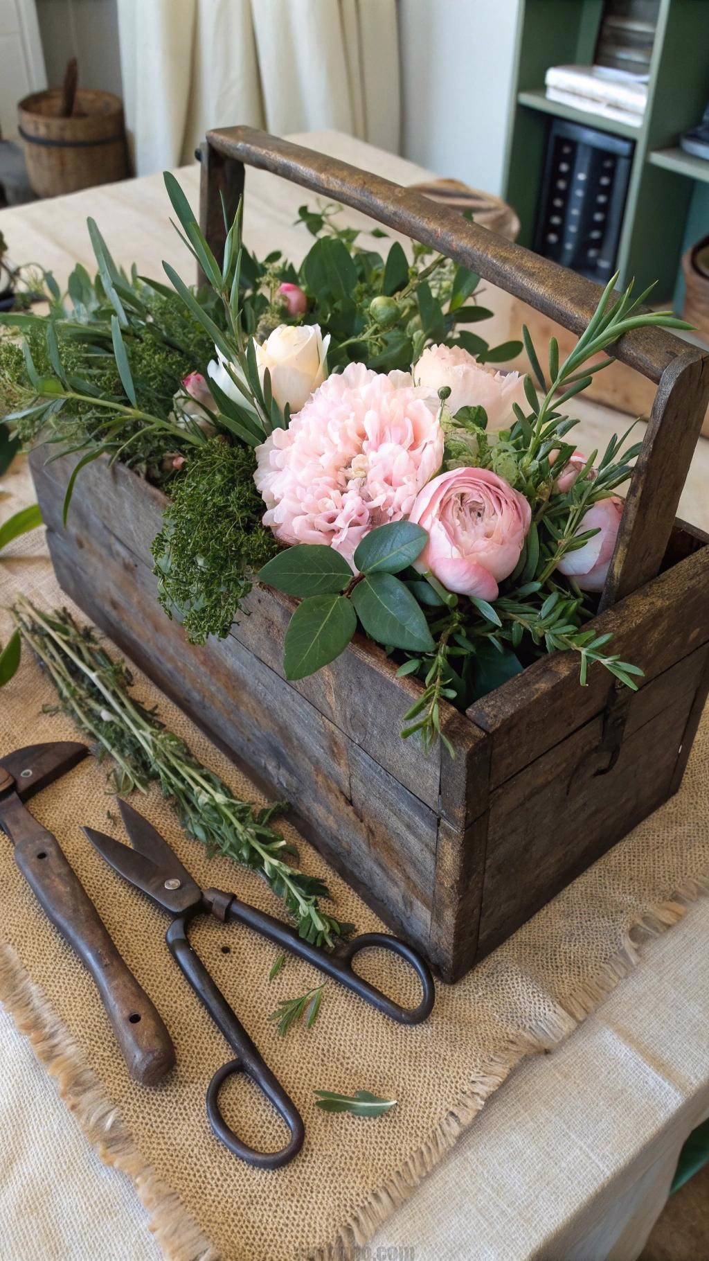 An old wooden toolbox makes a charming vessel for floral arrangements. The long, narrow shape is perfect for rectangular tables. Fill it with a mix of garden roses, herbs, and trailing ivy for abundant texture.
