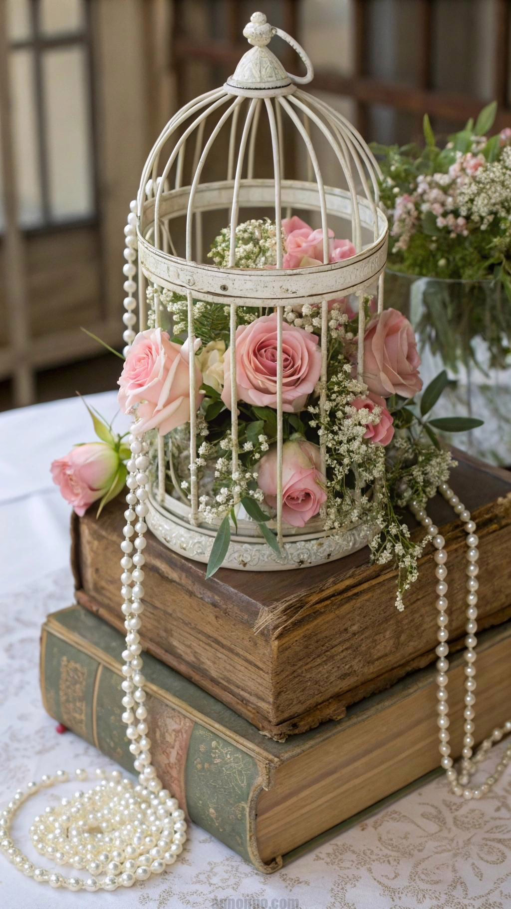 Hang crystals or pearls from the cage for extra sparkle. Place it on a stack of old books for height variation. This works well for shabby chic or garden weddings.